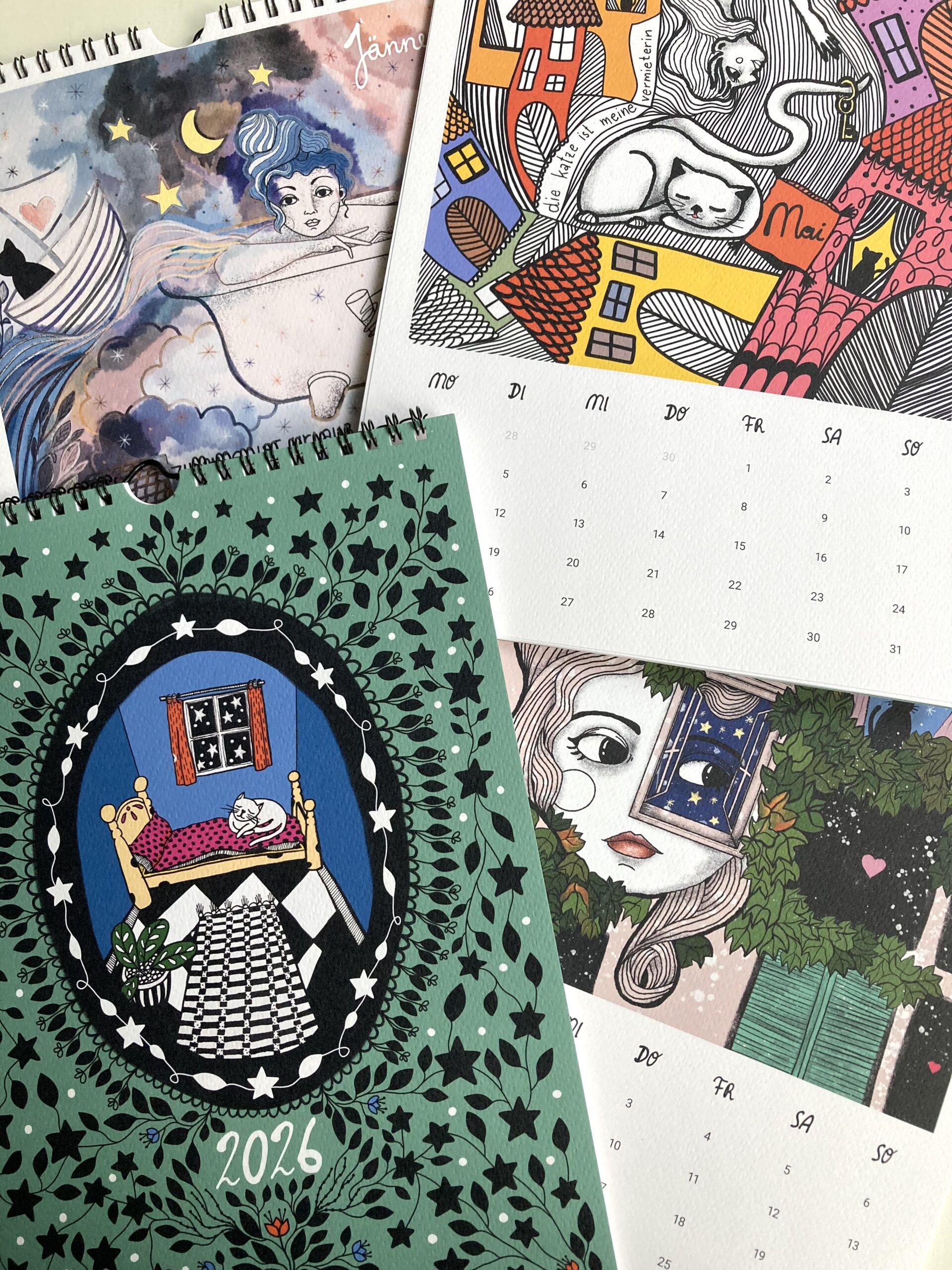 Wandkalender mit 14 Seiten und 13 Illustrationen von Natalie Ofenböck und Simone Dueller mit Sätzen von Nino Mandl und Martin Dueller
